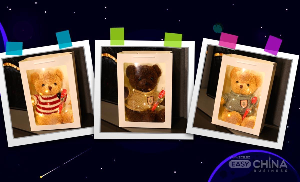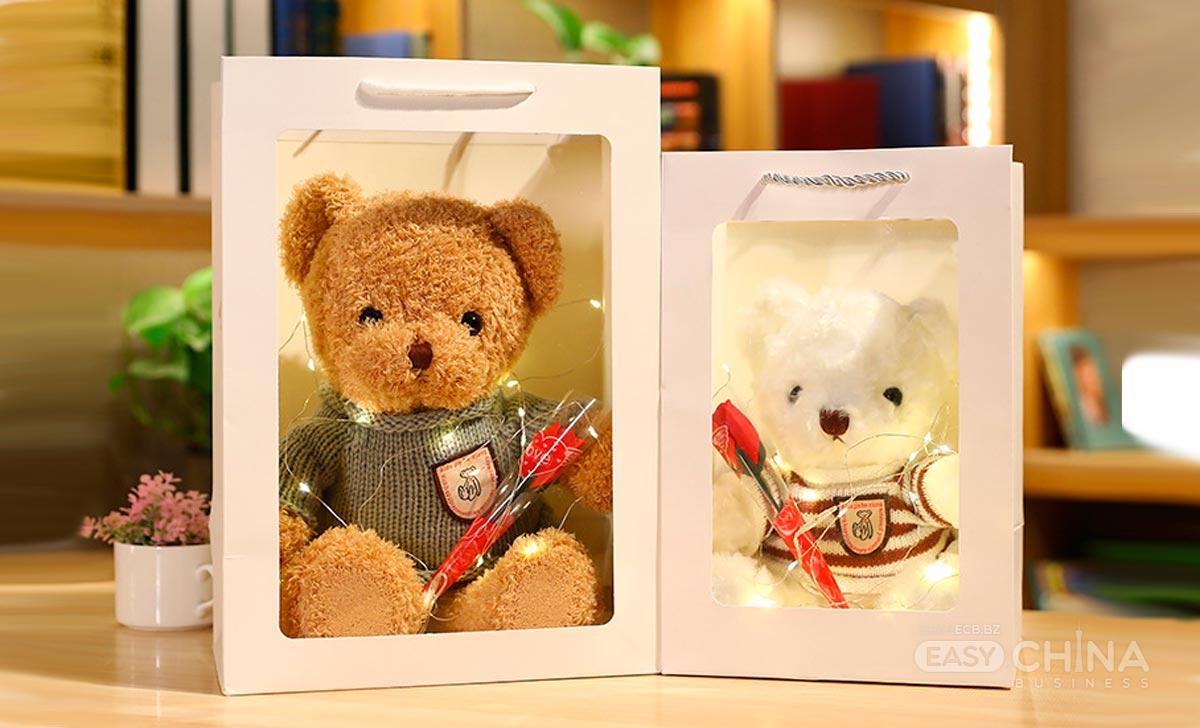 подарочный пакет, плюшевый мишка, цветок розы, гирлянда (элементы питания в конмплект не входят)